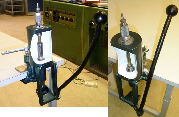 Olen näinud ka lihtsamat : puurpingist ( enamus ehituspoodides olemas ) valmistatud ,treitud vahejupp ,et saab matriitsi kinnitada ja valmis . Ainuke vahe on selles ,et kuul pressitakse ülevalt alla ,mitte ei tõsteta hülssi alt üles . Peab olema piisavalt tugev ,üks odav lagunes laiali ja pulk hakkas läbi painduma kui suuremat jõudu rakendada :? . Aga mingi ~1000kr saab korraliku.