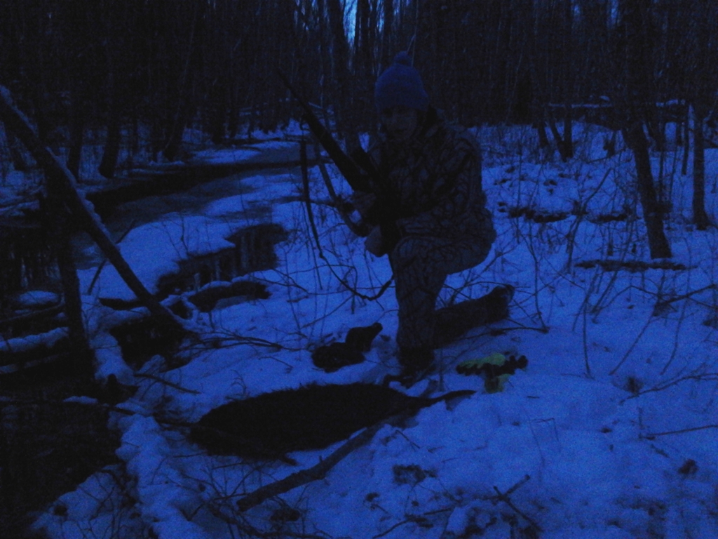 Nii sai siis täna ka käidud olenemata sellest, et ilm on lumine oli õhtu ilus(päike). Sai lubatud õelapsele, kellel oli hiljuti sünnipäev, et võtan ta jahti kaasa. Ise eriti midagi ei oodanud sellest jahist, sest läksin ühte uut kohta avastama, kus polnud veel see kevad käinud vaatamas ja üheksa-aastane laps lisaks kaasas. Sügisel sai samas kohas tehtud urujahti Feeni ja Kakukesega ning üks loom tabatud. Pärast seda olevat ülejäänud loomad allavoolu järve poole kolinud. Esialgu siis läksime ja vaatasime vana pesakoha üle, seal oli vaikus. Siis tuli hakata allavoolu matkama, kuna endal polnud aimu kaugel need koprad seal olema peaks. Lõpuks siis jõudsime mõõda oja äärt liikudes kohta, kus vesi hakkas tõusma ja paistis ka närimist olevat. Mõõtsin praegu maaameti kaardilt, et matk oli 1 km vanast pesast. Vahepeal polnud mitte ühtegi tegevusjälge ja olin juba lootust kaotamas. Tegime siis korraks puhkepausi ja otsustasime, et istume ühe langetatud puu najale ja jääme ootele. Jõudsime vast mõne meetri astuda, kui nägin 25 m eemal ühte kobrast tammi ja kalda ääres tegutsemas. Kükitasime siis maha ja vaatsin, et kas saan ehk selle ära lasta nii, et ka kätte saaks. Nii, kui olime maha kükitanud ilmus veealt nina ette 10 m peale üks uus kobras, kes jäi mingile madalikule istuma nii, et pool keha oli veest väljas. Tõstsin püssi palge ja vormistasin selle koheselt ära. Kui läksime looma veest välja tirima, siis ujus teine loom nina alt läbi ja pani sabaga korraliku paugu nii, et laps ehamatas korralikult.