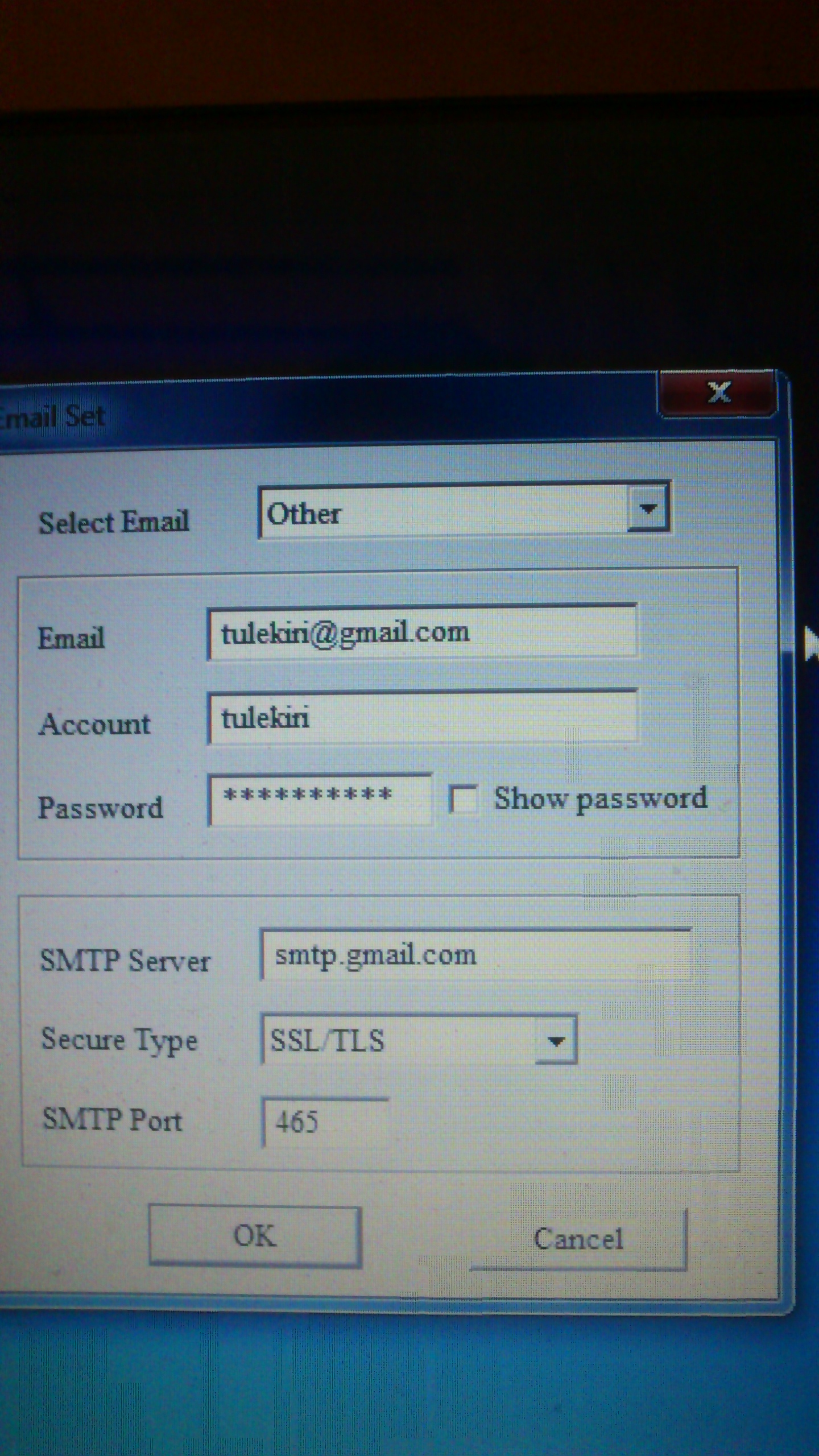 Kasutada SSL ühendust ja gmail kontoga.