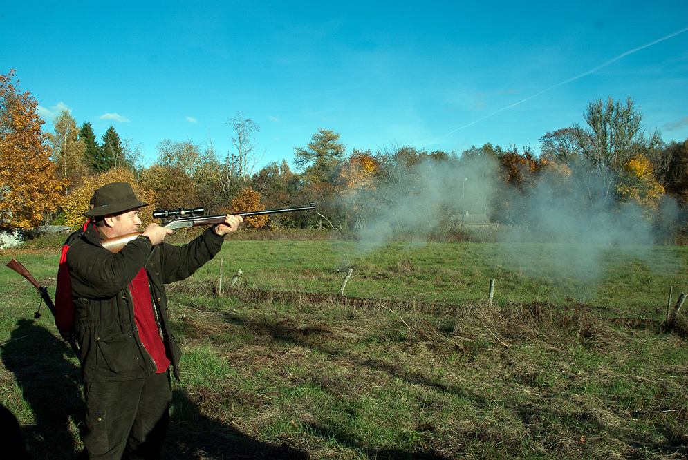 Jaan vajadusel oma relvast ise räägib....Minul selline vanakooli lahti murtav 45-70 ja valan ise kahte kaalu tinakuule. Kergem 22 gr ja raskem 32,4 gr. No ja kuda sa vana relva ja raske tinakuuli " eeliseid " ikka esile tood, kui ei kasuta musta püssirohtu. Pildil kaks meest sihivad, aga kuna pilt lasu kaja edasi ei anna, siis tänu mustale rohule tossupilv raua ees annab aimu meeste tegevusest. Koffer on heasti ära tabanud püssi üles viskumise momendi ja julgen täie tõsidusega kinnitada, et märklaud puuladvas ei asunud.
