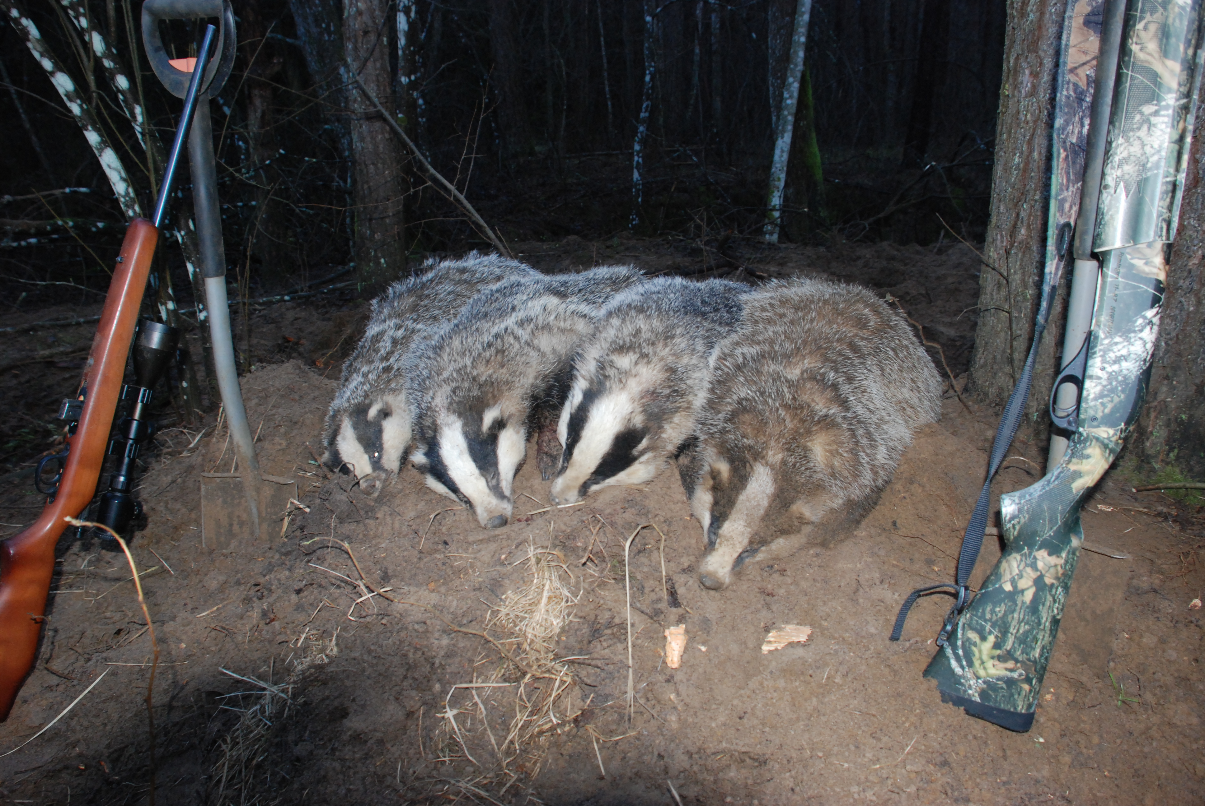ei see ikka 22LR. Mina olen ikka nii teinud, et kui loom tupikus ja oled juba koerani lahti kaevanud, siis koer välja ja 22lr-iga asi ära lõpetatud. mingeid trosse ma kaasas ei vea, et teda välja sikutada(pole sellist) ja kaikaga ei uhmerda ka!