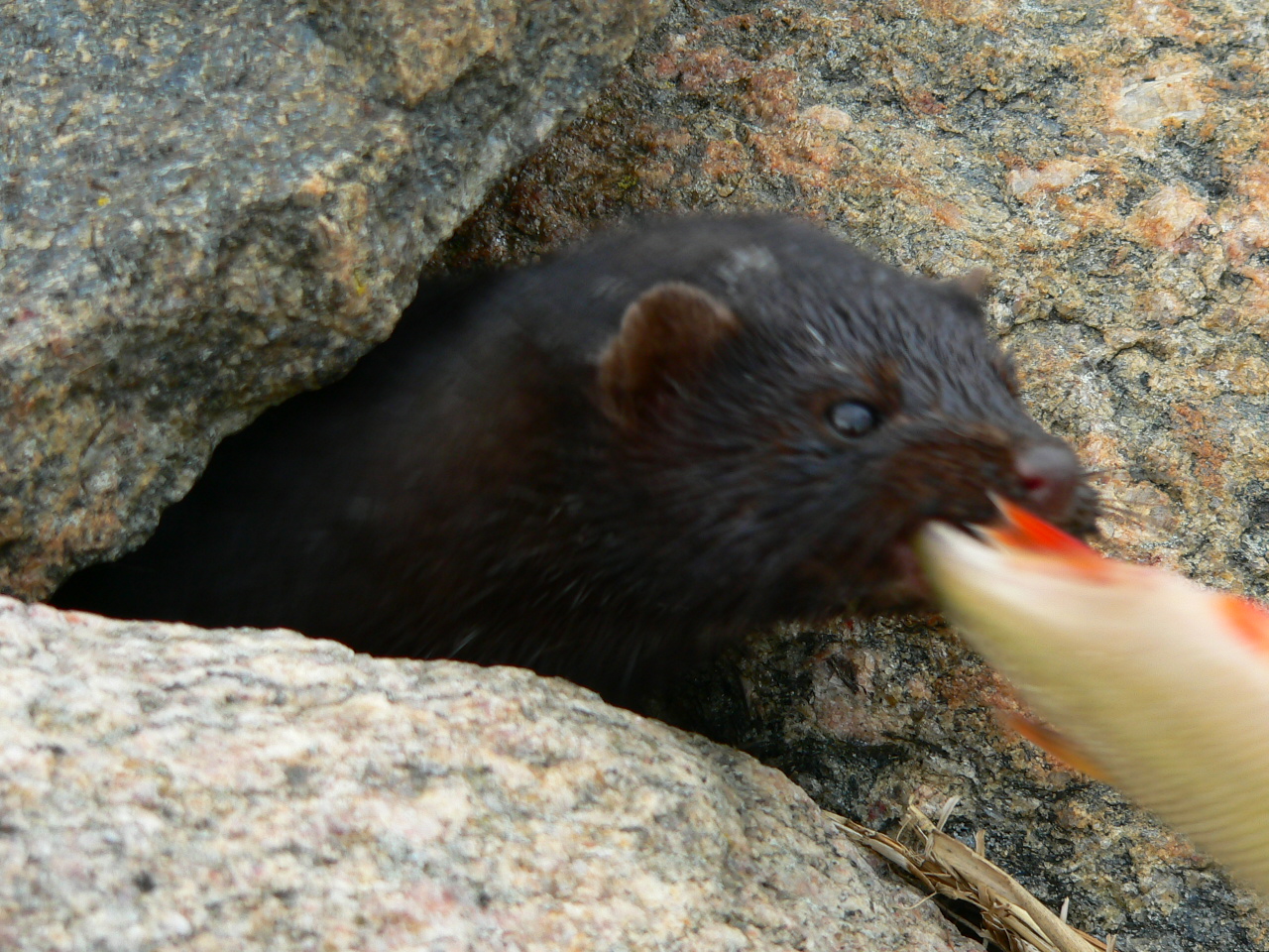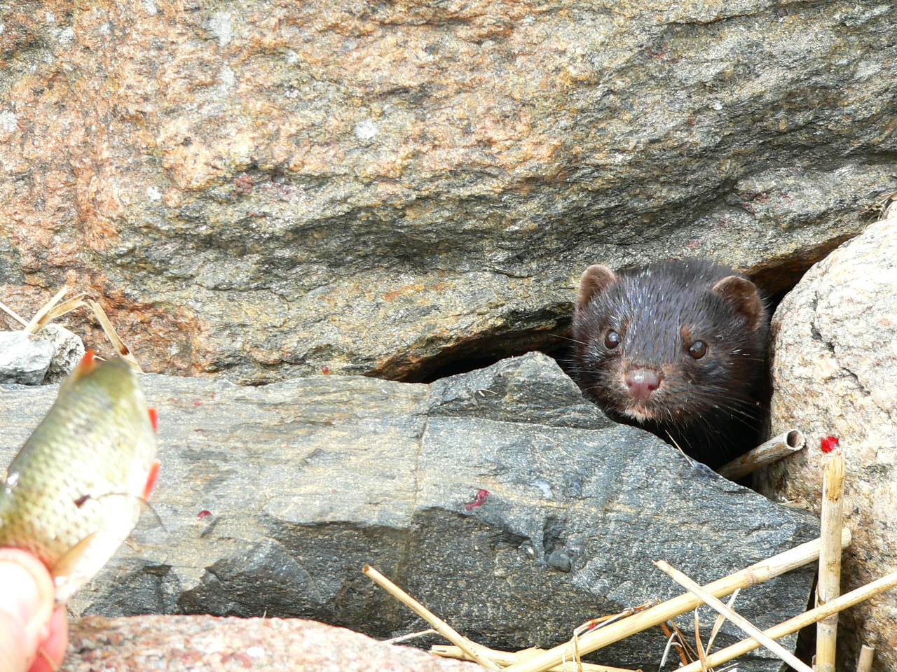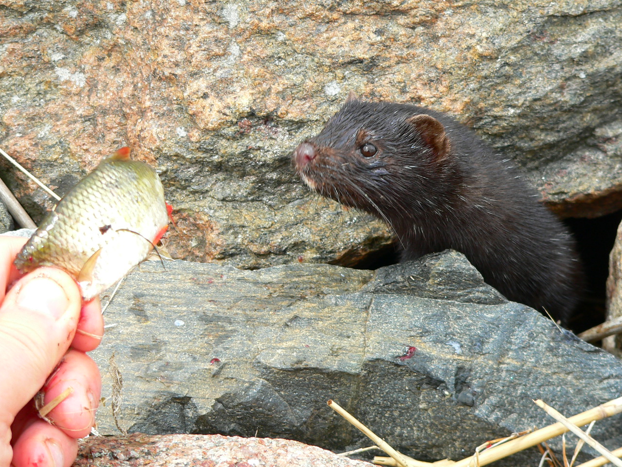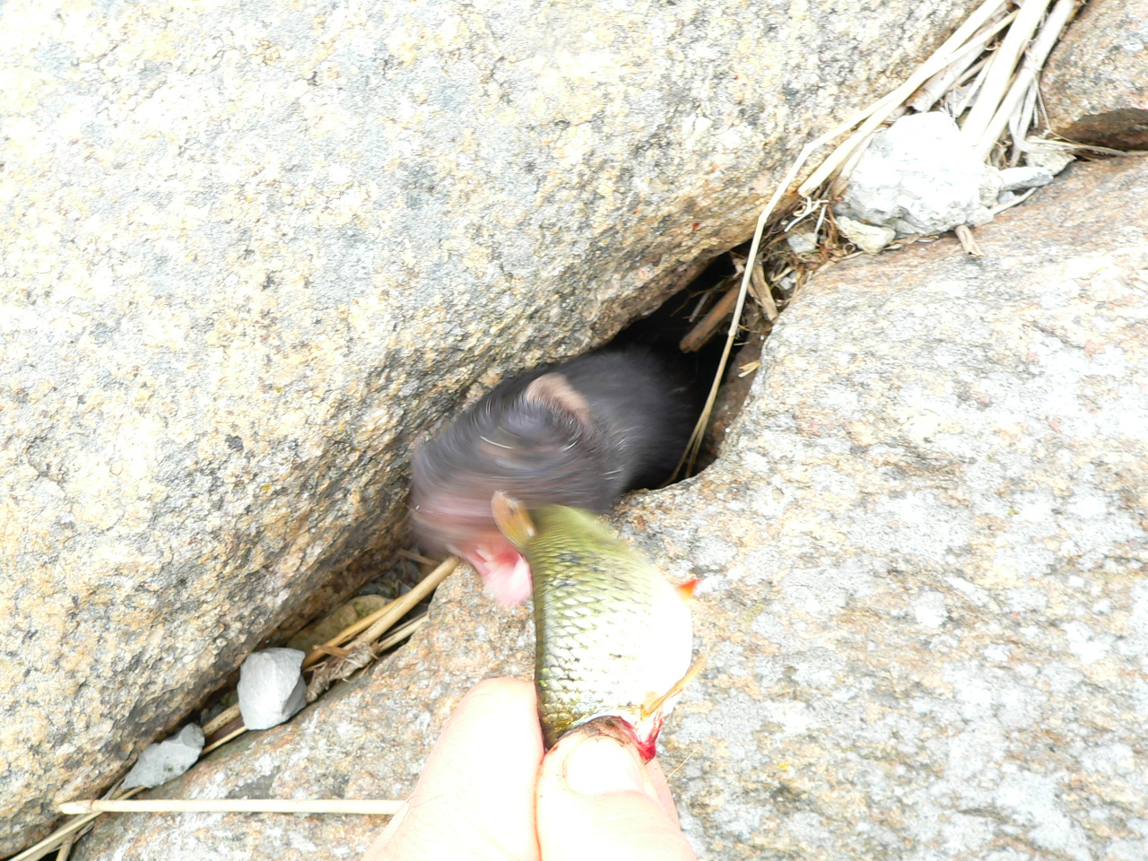 morda vahib vastu, no pold esimese korra fotokat kaasas ja täna peale jaani läksin uuesti. Ju ta oma pesa kaitses. Seal kivide vahel terve pesakond, sest erinevaid hääli kostis korraga mitme kandi pealt, aga näha ja pildistada sai vaid ühte. Sai eelmise korra kala antud ja ikka kõvasti meelitatud ja uskuge, iga pildi kohta tuli 4-5 tühja klõpsu. Ta oli nii kiire, et kahmas kala kiiremini, kui fotoka päästikule suutsin vajutada. Ju ta minu tegevust kalade püügil selja tagant hoolega jälgis ja oma pisikese ajuga analüüsis, et ma talle ohtu ei kujuta, sest nüüd teise korra oli ta julgem. Üritan paar pilti juurde panna, kus see kiirus kah näha....Samas 10 aastat vana ja pika mõtlemisega fotokaga pold sellise "välgu" jäädvustamine üldse lihtne ja "võetud" sai nii 60 sendi kauguselt, ise kah imestasin, aga ennegi elukad mind peale pikka "manipuleerimist "omaks võtnud.