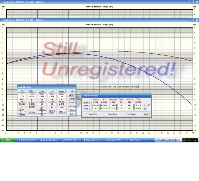 Et kuuli langusest vähe aimu saada panen ühe pildi ballistilisest kalkulaatorist kuuliks Gamo pro magnum sihiku kõrgus 2cm (umbes lahtise sihiku kõrgus) näitel on nulliks pandud mõlema kiiruse juures 10meetrit sinine joon 170m/s ja punane 270m/s paremal ja vasakul kuuli langus cm.Kui suurema kiiruse juures lendab kuul peaaegu otse 30meetrit, siis 170m/s juures iga viimase meetriga juba ca.1cm :shock: Näiteks pudelikorgile ei saa saa juba selle pärast 25meetrilt esimese lasuga pihta, kuna sa ei tea kas kork on täpselt 23meetril või 27meetril :D