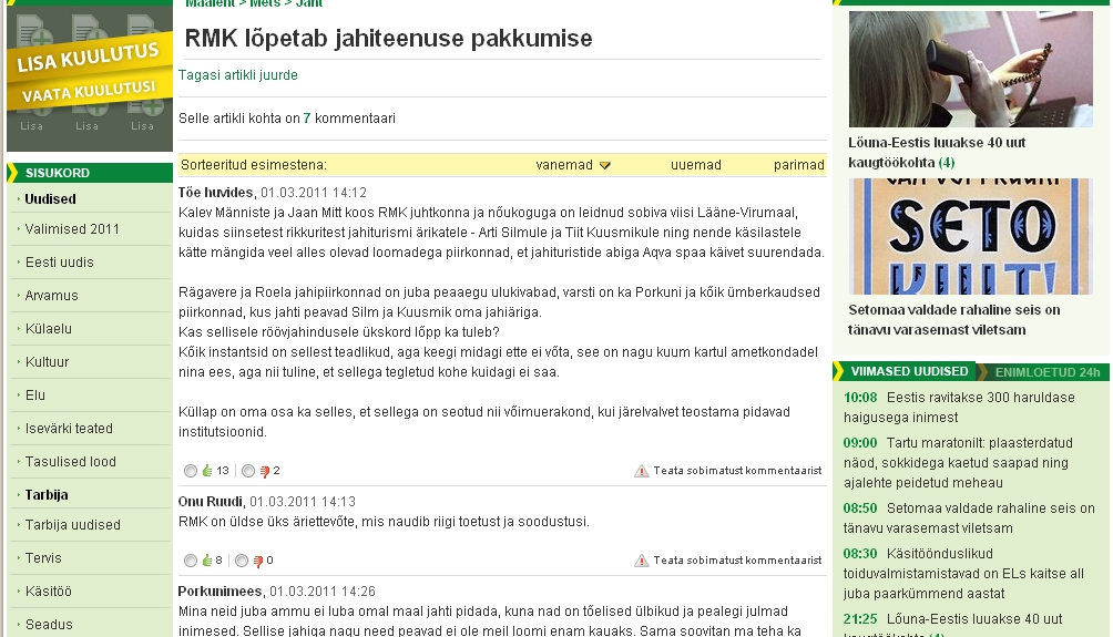 Vot selline suhtumine mulle nagu seal kirjutatud on ei meeldi mulle üldse. Tuleb meelde Lillemäe jutt jahikoolituselt kus analoogne juhtum oli Poolas (kui õieti mäletan). Selts ostis omale jahiõiguse (vormistades selle tankisti nimele), lasti piirkond piltlikult öeldes puhtaks ja siis öeldi et pankrott.
