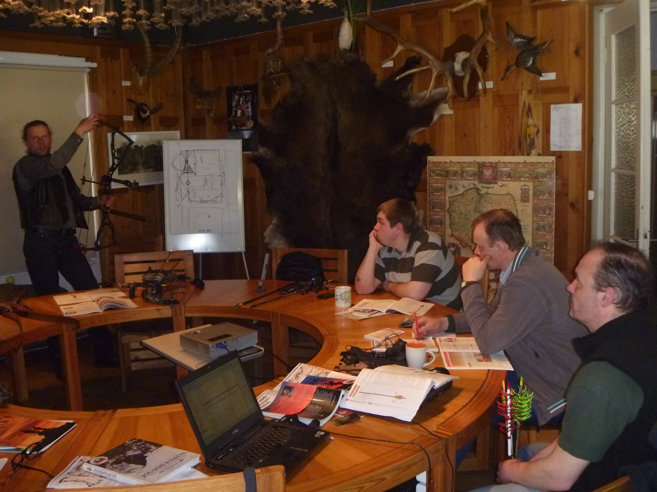 No nii, kursusel käidud, väga viis pluss. Minule istus programm nagu rätsepaülikond s.t. oli kokku pandud just selliste kuulajate jaoks, kellele pole pikalt vaja rääkida jahipidamisest üldse kuid kes, teiselt poolt, ei oma plokkvibu kogemust. Istusime küll suurema aja laua ümber ja kuulasime-rääkisime ning metsas me ei roomanud kuid minu keel tõrgub ütlemast, et kursus oli teoreetiline. Muidugi oli seal vibuteooriat vajalikul hulgal ja vajalike nurkade alt kuid kaks päeva olid lauad ikkagi vibusid, nooli, nooleotsi ja igasugu nööre-pukke-pinke täis ning käed said uudishimu rahuldada võrdselt silmade ja kõrvadega. Nii et see oli väga ja vägagi praktiline kursus.