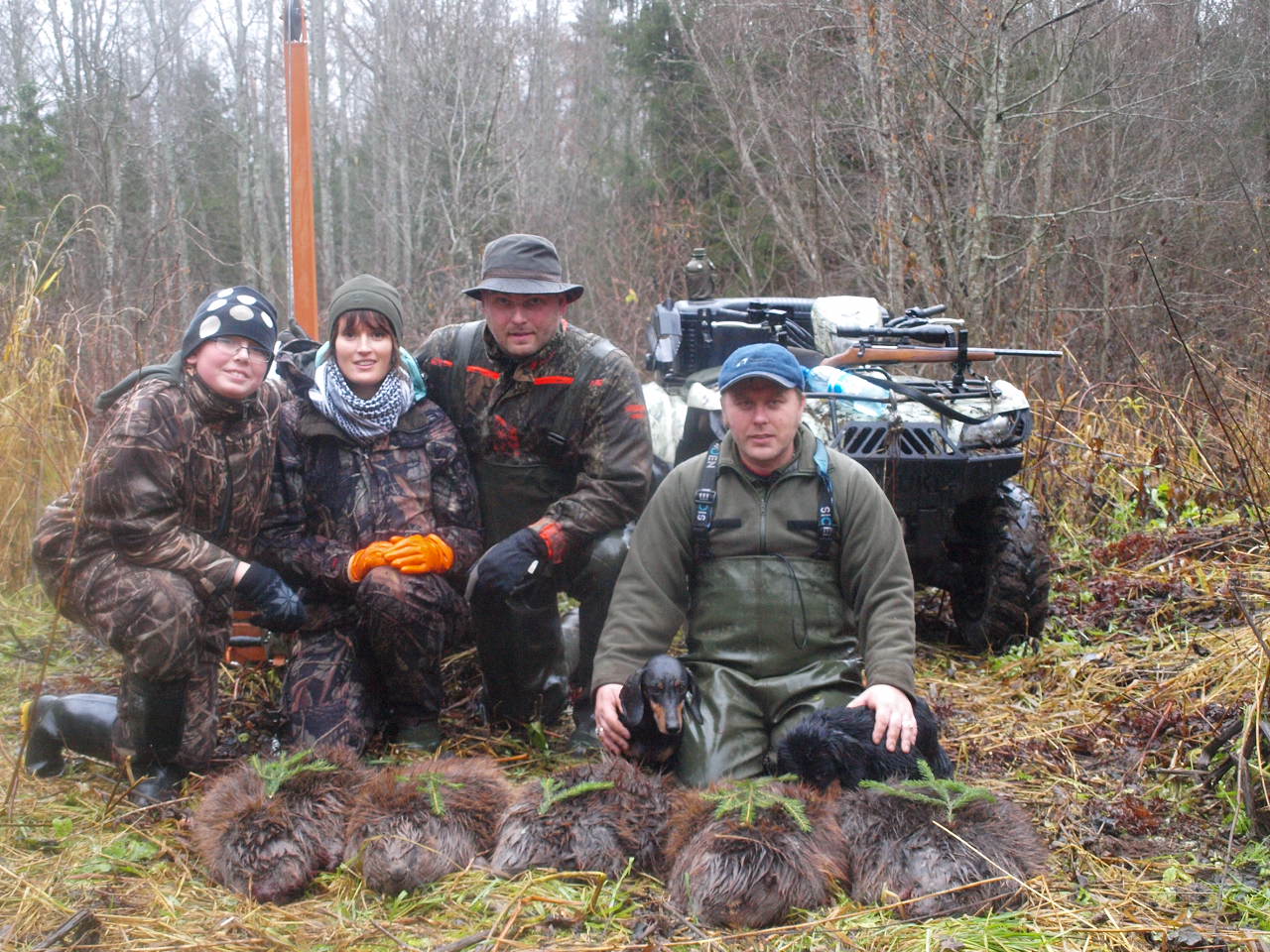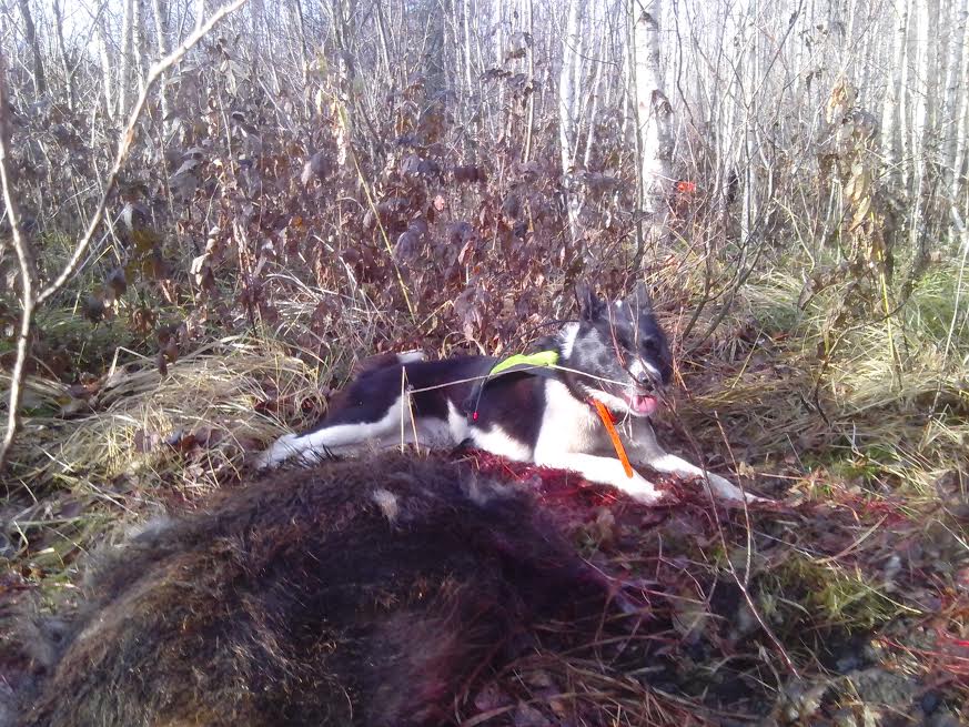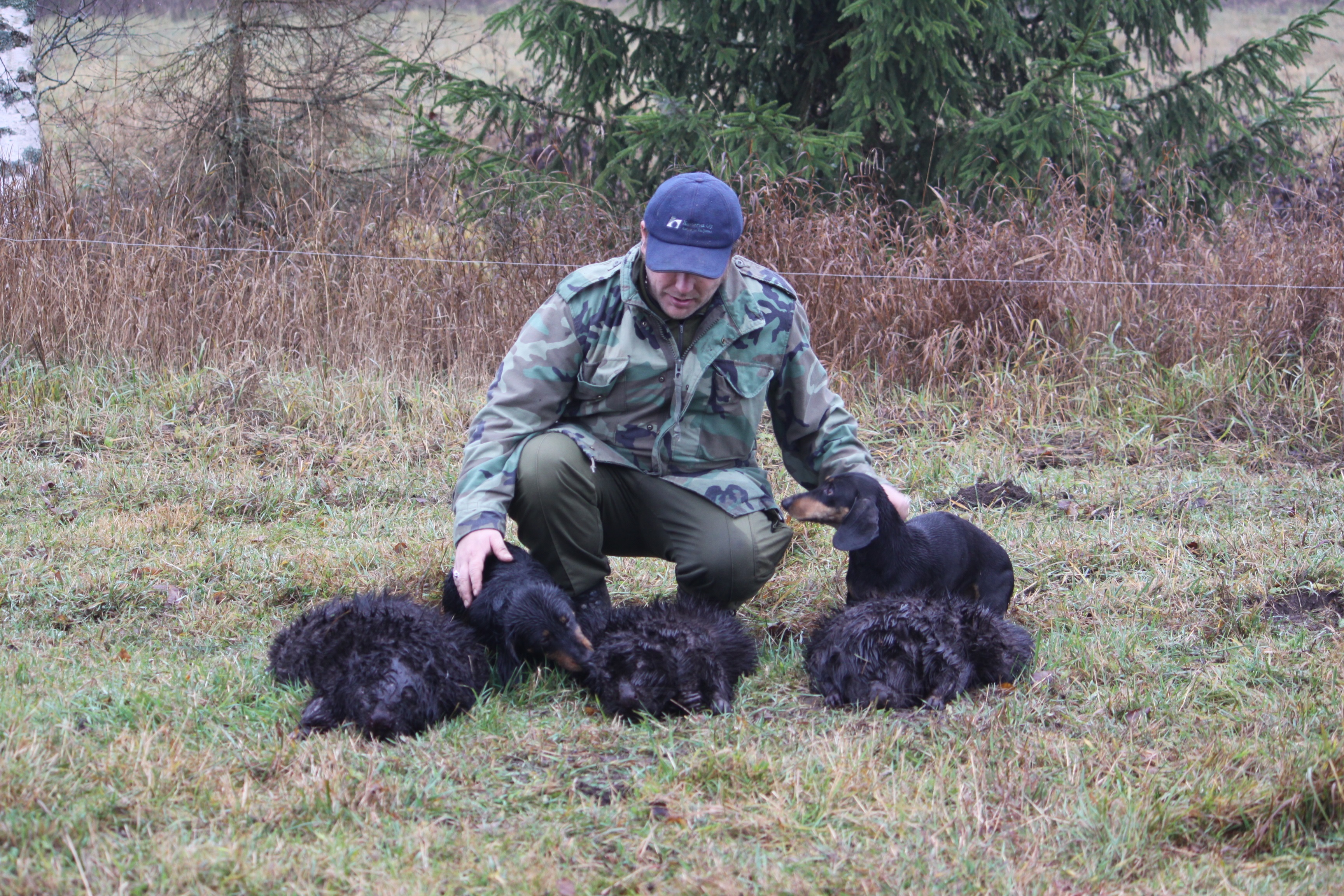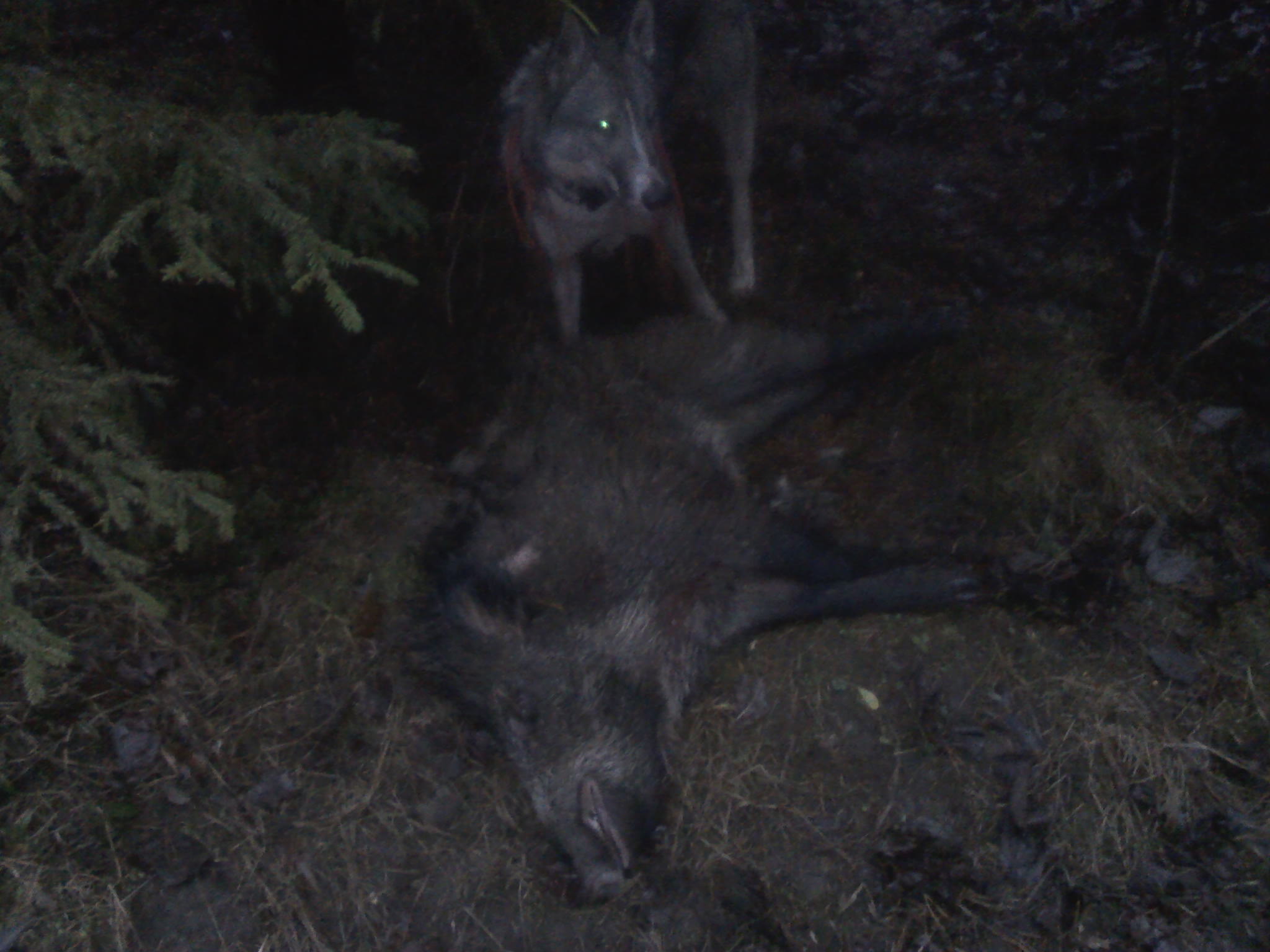 Täna oli siis niisugune ilus jaht,kus ajajateks olid ainult koerad,kaks norrakat,kaks jämtlandi ja minu koeralaadne asi.Norrakad võtsid üles seakarja,minu koer selle 3+4pull,kes pildil ja jämtlandid ühe teise natuke suurema pulli,kellest seni teadmata põhjustel kolm pauku mööda lasti