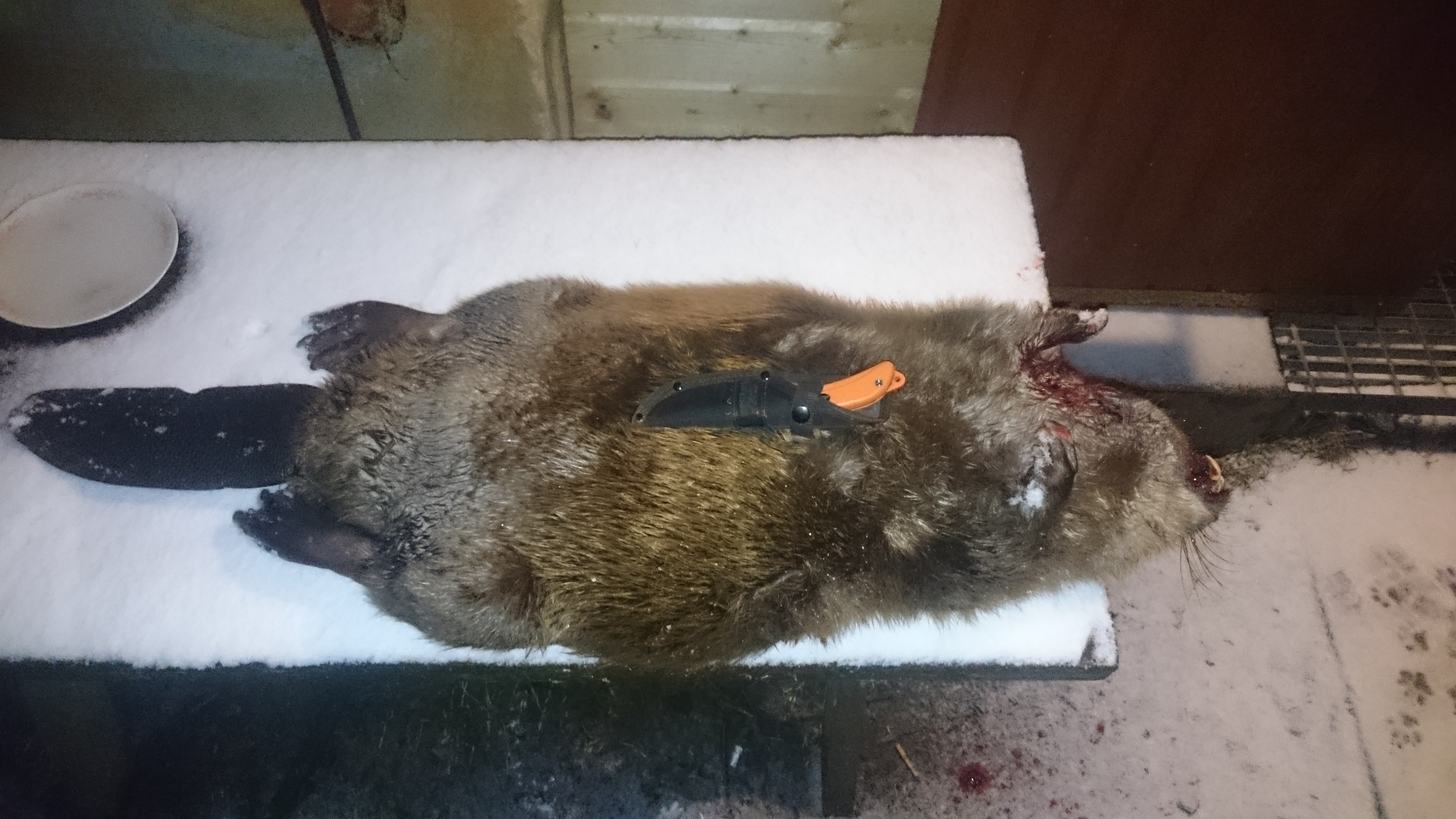 Ajasin rebaseid taga. Siin peibutasin seal peibutasin ei midagi. Hakkasin koju tagasi sõitma ja nägin üle kruusatee värskeid kopra jälgi. Ei tea miks aga selle kandi koprad just suured ei lähe mitte läbi truubi tee alt vaid üle tee (väiksemate puhul ei ole täheldanud seda). Kiirelt autost välja ja mööda kallast allavoolu hiilima kuu taevas võimas (kell 21..)ehk ei ole veel jõeni jõudnud. Max 75m sain minna kui kuulsin juba söömist. Natukene peilides ja lähemalt uurides nägin ühe puu juures lumel askeldamas. Ei tundunud suur kuid igaks juhuks ei hakkanud pähe sihtima. Ootasin ja ootasin ikka näoga minu poole ja sööb. Lõpuks läks vette ja tuli minu poole kallast ja seekord diagonaalis pilk ojale. Ühesõnaga olin pealt tuule ja otsustasin kiirelt tegutseda. Püss palge kopra selg paistis lootsin et kuul läheb keskelt läbi kuid keeras pikki selgroogu sinna kuhu kartsin. Põmm kolju puruks. :( Oleks teadnud et nii läheb oleks laskmata jätnud.