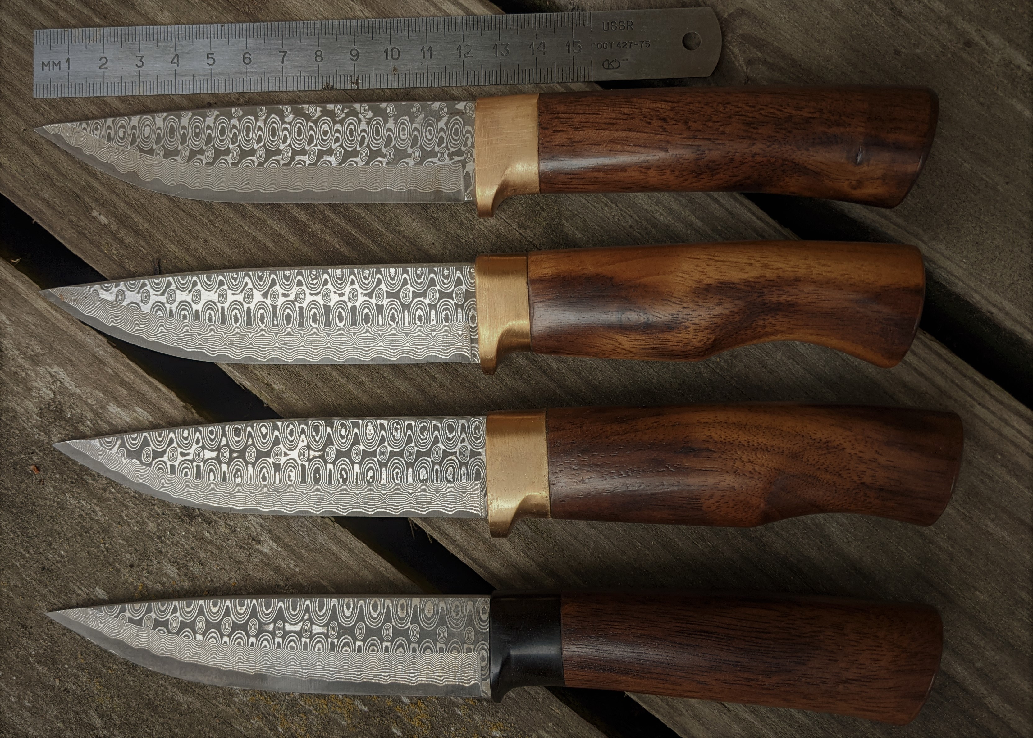 Ega ma nuge otse müügiks ei valmista.Olen mõnele heale jahikaaslasele teinud.Tööd on korraliku noaga,küllalt,penskarile paras nokitseda.Tera on damaskusest(vämees tellib tooriku).Noapea on kreeka pähklist või palisandrist.Noakolju vanapronksist,mustast eboniidist,pronksist.Tuped noale teeb proff sadulsepp.Hind kujuneb vastavalt nõudlusele.Nuge teritan:esmalt 650,teiseks lihviks 1000 teemandluisuga(luisule piserdan püssipuhastus õli).Hind noale keskmiselt 250 mõned rahad siia-sinna.Hetkel noatoorikud tellimisel.