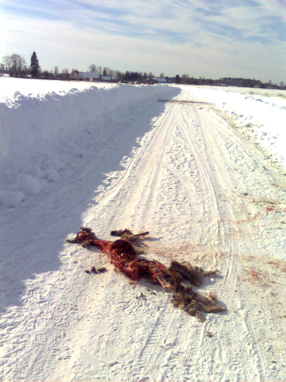 .Ei jätnud meie ka jonni ja helistasime siis politseisse,sealt saime umbes sama vastuse.Kui küsisime kohaliku konstaabli telefoni,siis vastati ,et on puhke päev ja nad annavad meie kontakti ja millalgi võetakse meiega ühendust.Kuna sadas lund siis sai selgitatud ,et momendil on kõik veretöö jäljed tuvastatavad ,mis ei pruugi enam järgmiselpäeval olla.Tegime siis politseile ettepaneku,et me ei nõuagi kellegi trahvimist ,tahame vähemalt olukorra fikseerimist ja kohalikus lehes inimeste hoiatamist.Asi päädis lõpuks sellega ,et politsei ajas siis 1313 asjapulgad jalule ja ka patrulli mehed käisid sündmust pildistamas.Kohale tulnud keskonna inspektorid ,konstateerisid fakti ja kogu lugu.Soovitus kõlas (mitte ametlik) probleem endil metsas lõplikult lahendada.Umbes sama jandi olid ka imavere mehed läbi teinud. Paneb ikka kukalt kratsima küll,on siingi olnud soovitusi helistada 1313 ja asi saab korda ,aga võta näpust.Kui jahimehel juhtub püsski autos kotist väljas olema siis..... ,oled "riiklik kurjadegija"! Millist lamenti lüüakse,kui keski kuskil mõne hulkuva koera maha on lasknud,no ma ei tea,selline asi võtab ikka mõtlema,kus me ikka elame ja keda siin riigis kaitstakse