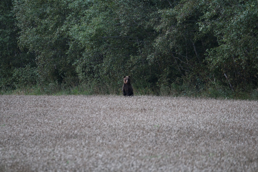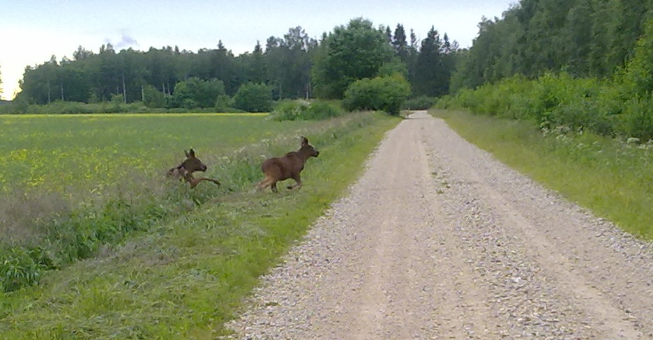 .Jälgisin nende tegemisi pea tund aega.Siis tegin vaikselt häält,mille peale vana tõusis püsti ja lõpuks vajus vaikselt metsa.Järgmine hommiku käisin Britaga jälge mõõtmas( emal 12cm,ühel pojal 7cm,teisel 9cm).Koera võttis lõhn päris ärevile aga metsa eriti kaugele minna ei julenud.Poeg on mul siuke pildistajavend.Seega otsustasime laupäeva õhtul vaatama minna,kas tulevad uuesti põldu.Tulid küll ja juba pool üheksa nii,et mina polnud veel teise pukki jõudnudki.Jälle sai neid tund aega jälgida.Poisid on väiksed,ei paista viljast välja.Üks oli tumedam,selle sai pilti,kui püsti tõusis.Väiksem sebis rohkem ringi nii,et vana pidi pidevalt püsti tõusma,et näha kus laps on.Ütlen ausalt,minule väga mõnus elamus ja kordagi polnud mõtet,et sihiks püssiga.Muuseas,samast põllust lasti kaks nädalat tagasi üks ott ära.