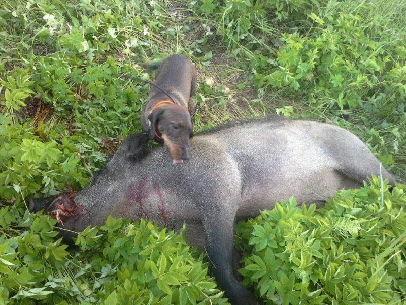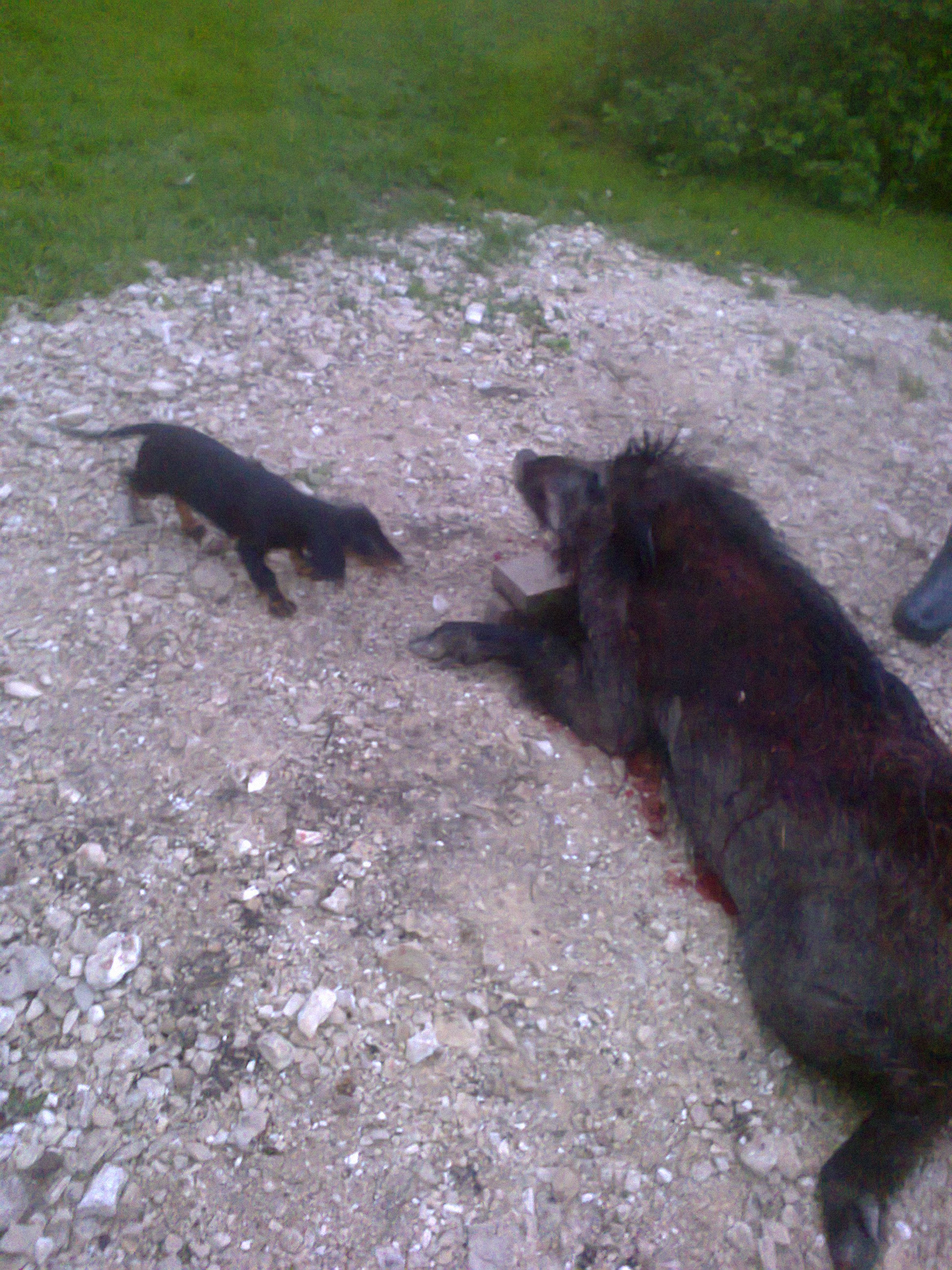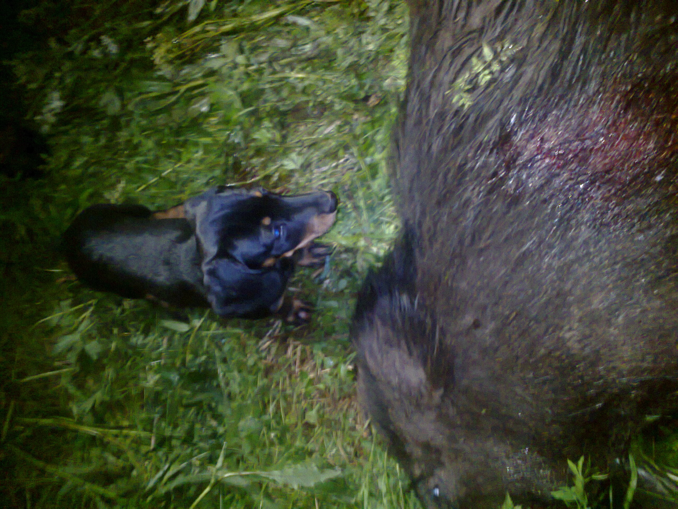 Värsket verd teemasse :) .Paar päeva tagasi helistas üks sõber õhtul,et lasi just siga,jooksis küll metsa ,aga kindlapeale maas ja kuna mul koeralaadne kutsikas on,et äkki tahan teisele siga näidata.Läksin siis kohale,siga oli söödapealt suure jooksuga minema pannud,jälgede järgi kesik,umbes 15meetrit olid jäljed hästi näha,verd ei olnud.Lasin koera jälje peale,algul keerutas niisama ja tundus et ei jaga matsu,kutsikas ka ju alles,siis läks koer suure rohu sisse ja hakkas pead püsti ajadaes rohukõrsi nuusutama ja järjest edasi minema,korraks kadus mul vaateväljast,natuke ootasin,siis kutsusin koera tagasi,ikkagi kutsikas ju.Koer tuli minu juurde,käskisin uuesti otsida,koer läks sama rada uuesti edasi,mina kiiresti järgi,läksime umbes 100meetrit siis algas päris korralik vererada,veel umbes 30-40ja siga oli leitud,korralikult ikka hauguti peale ka :D.