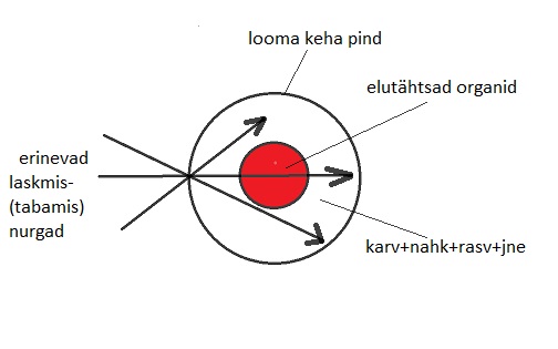 . Asi ju lihtne- videvikus ei näe, kas siga on risti(tuleb täpne pauk), poolviltu kärsaga laskja poole( sama kohta tabav kuul läheb soolikatesse) või sabaga laskja poole-kuul võib minna südame eest isegi nii, et vastasjalga ei riiva. Sama skeem alt ülesse või ülalt alla lastes.Aga kuuli tabamiskoht on seejuures sama ja võrdub sihtimiskohaga.Sama põhimõtte alusel näeb autos kõrvalistuja osutiga spidolt väiksemaid numbreid, kui autojuht ise.