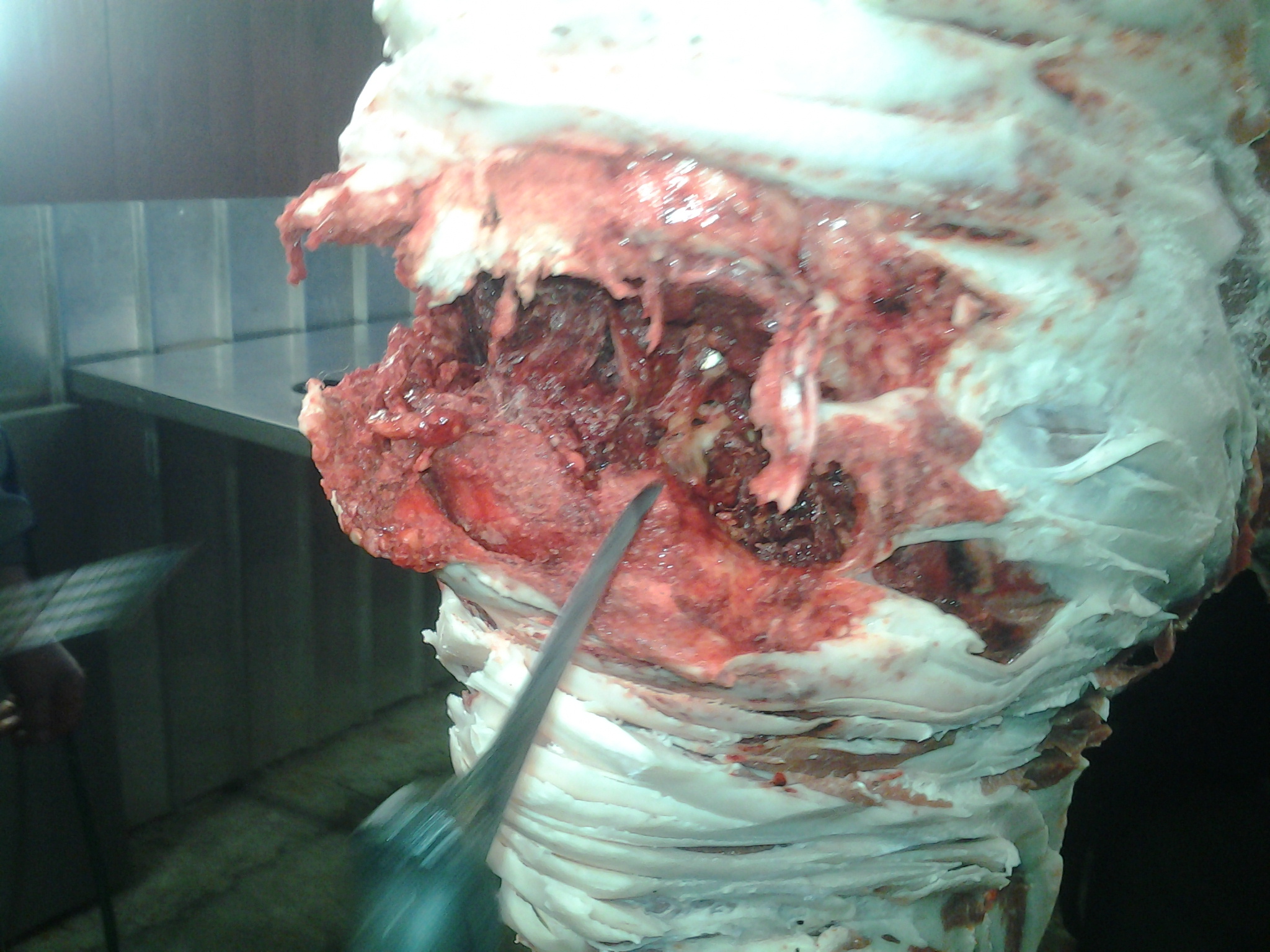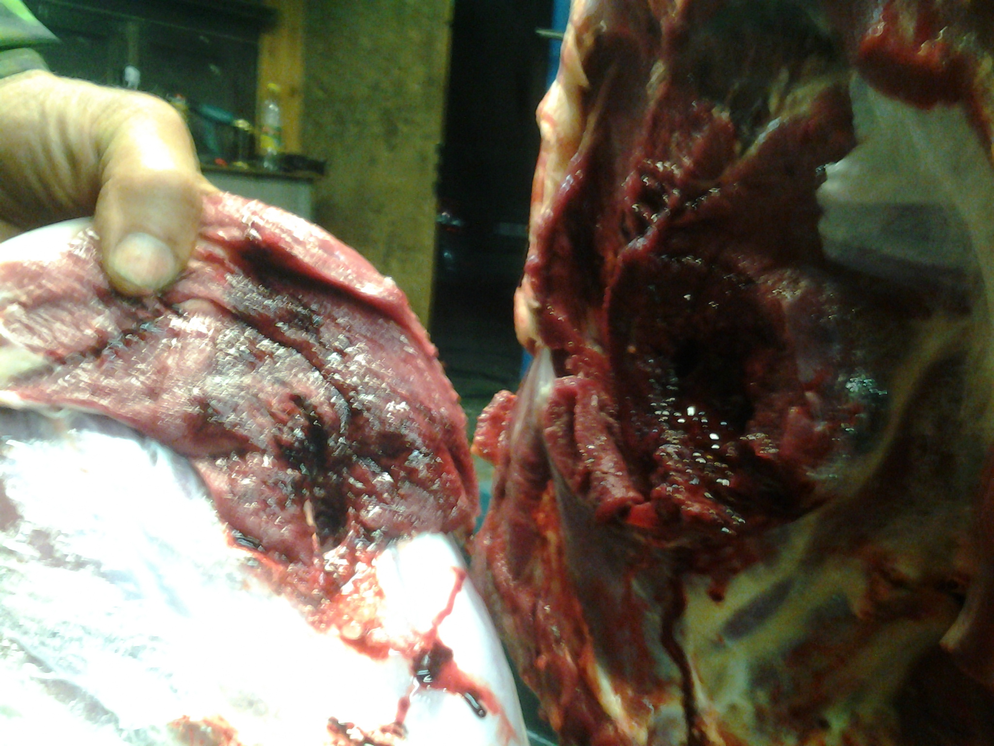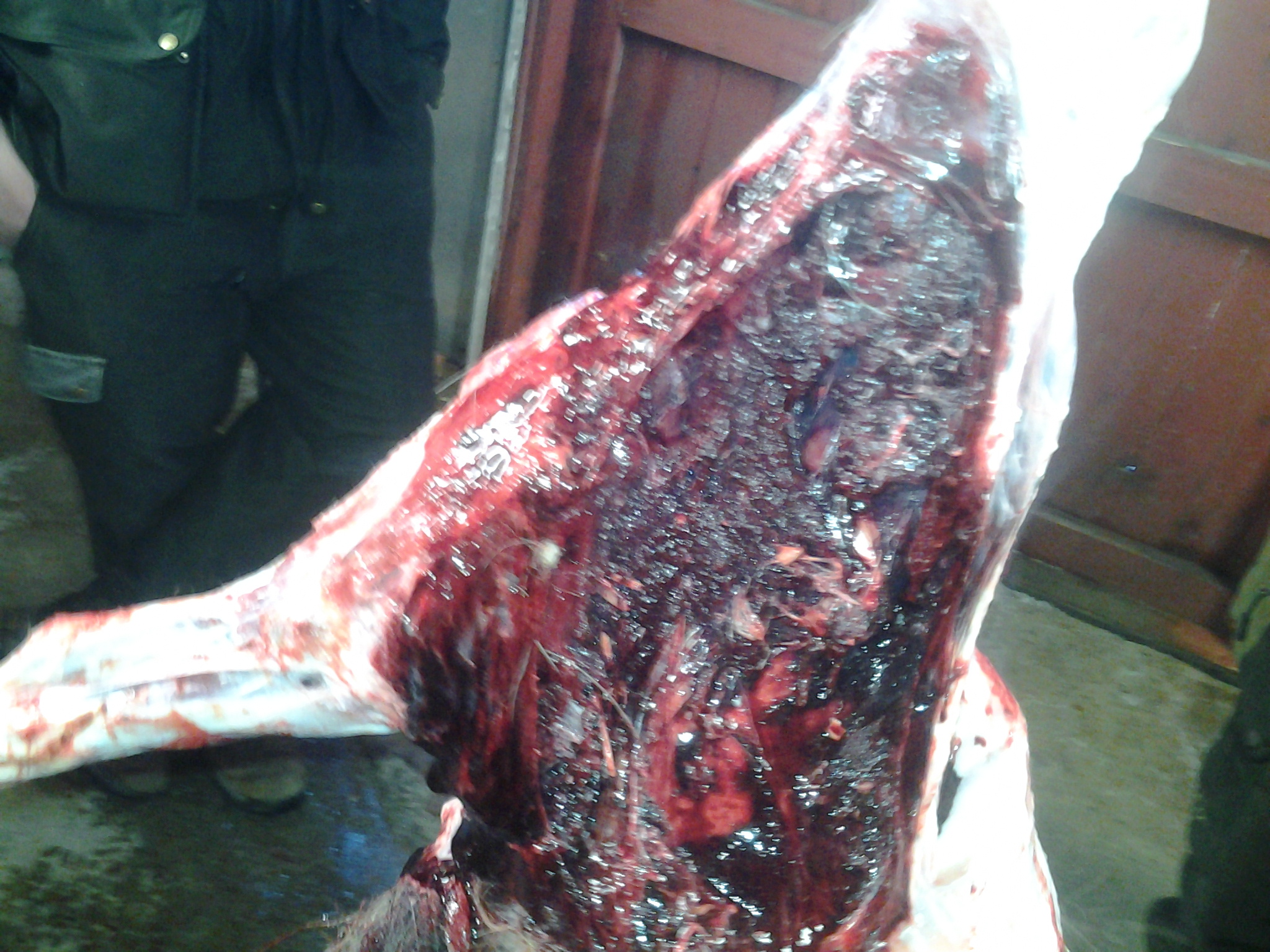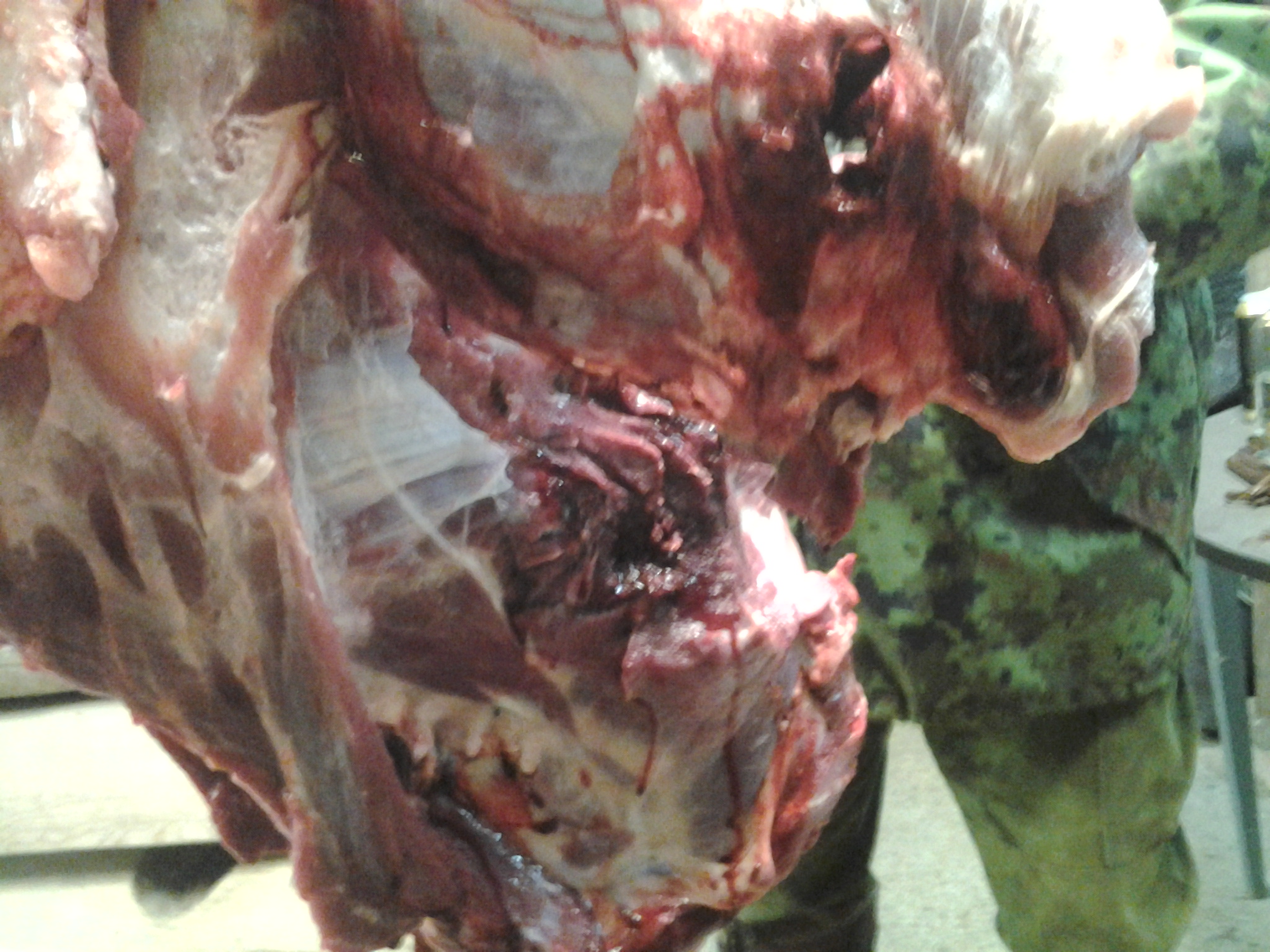 1.Siga 3a,lastud 25m risti seisvat,kopsudest läbi.Väljuv ava 5x5cm,loom liikus 10m.Ei olnud tilkagi verd väljunud,kõik oli rinnakus.