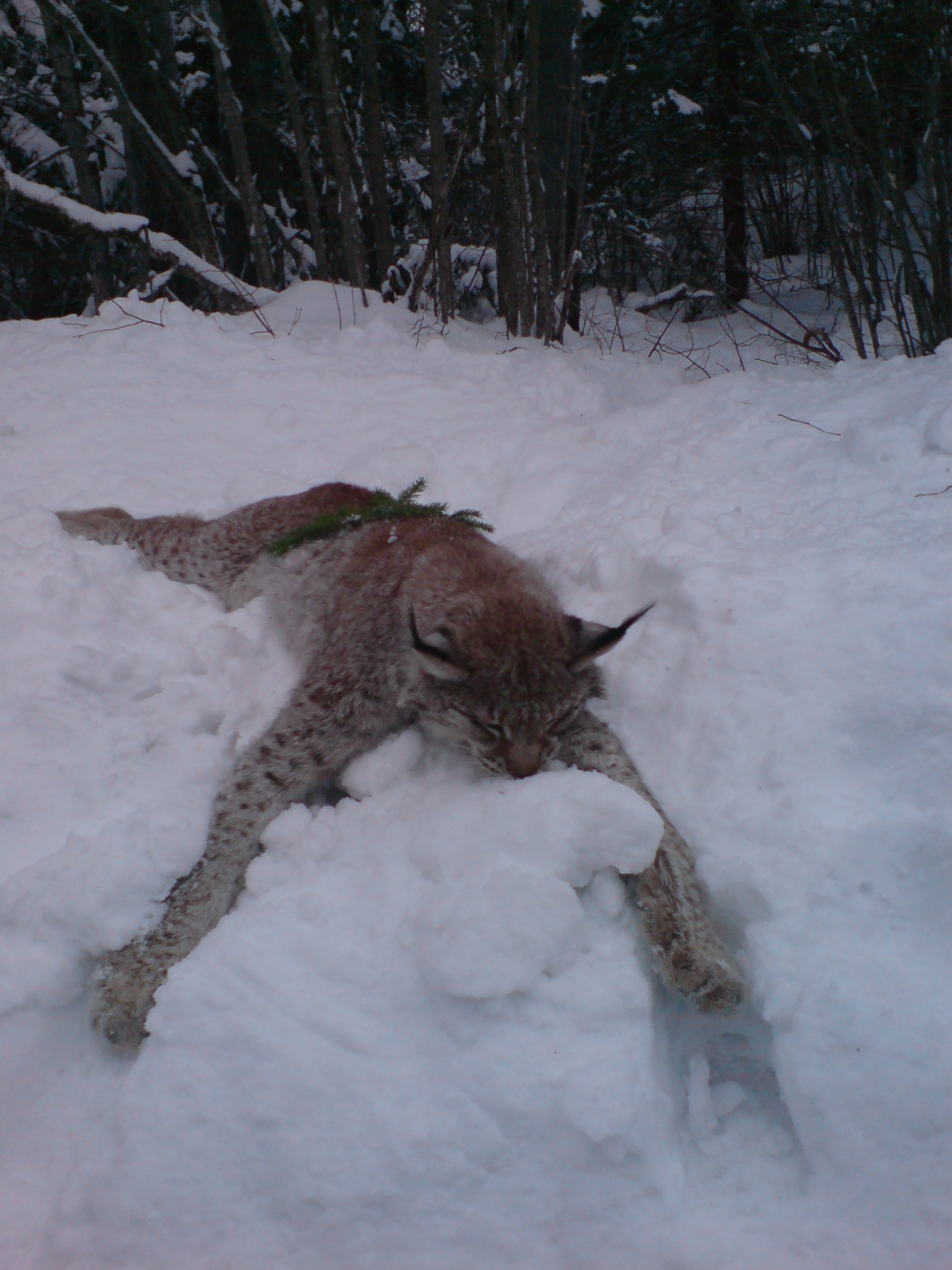 Hommikul sai siis kuidagi mööda täis tuisanud teed luurele mindud. Lootuses leida ilvese jälgi. Ei leidnud miskit. Siis tuli kõne jahikaaslaselt, et neil miskit olemas. Asjad kokku, koerad autosse ja minek. Hakkasime siis Dumaga ilvese jälgi mööda järgi minema. Duma koerad panid mööda sihti minema ja võtsid põdra ette. Seejärel minu omadel põdrad ees. Seejärel veel põtru ja hunnik sigu. Koerad madistasid kesikuga, aga kuna neid me ei lase praegu, siis jätsin nad omaette toimetama. Noore koera sain kätte, vanem ei raatsinud seast loobuda. Vaatas vaid mõistmatu näoga, et miks sa loll pauku ei tee nüüd. Vahepeal ütles Joosep, et tema juurest lähevad ilvese jäljed välja. Vaatasin gps`i ja tundus, et need samad jäljed, mida mööda läksin. Metsas oli koerte häält kõvasti, aga mitte ilvese peale. Natuke maad edasi minnes leidsin kahed ilvese jäljed veel. Läksin aga oma rada mööda ja peaaegu välja jõudes kõlas lask. Lasti ilvest, aga pani putku. Välja jõudes suundusin sinna, kus lasti. Koer sai teepeal varem lastud ilvest uurida ja jäljele pannes enam ilvese jäljelt kõrvale ei kaldunud. Kohe varsti kostus noorest kuusikust koera haukumist. Nägin, et ilves ja koer jooksevad otse mulle peale(kuradi kiirelt ikka silkab