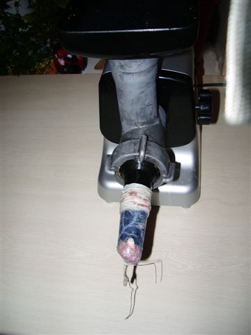 Mul jupp aega toorvorstid hingel püsinud, kuna klassikalisel viisil ulukilihatoitudest hakkab vaikselt küll saama. Mäletan, et Kaupo kokaraamatus oli sellest juttu ja võtsingi ette selle retsepti, aga nagu ikka modisin selle omamoodi ära. Mul oli põdra ja metssea hakkliha pooleks. Kokku tuli ca 7kg. Soola panin vähem, kui retsept ette nägi ja 6 supilusika täie asemel sai 4 (naine arvas, et võiks isegi veel vähem olla). Pipart ka nõks vähem st 4 teelusikatäit ja on tunda vorstis, et ikka on sees pipart. :D Asendasin ise sibula küüslauguga, seda sai 2 mugulat. On mõnusalt tunda küüslauku. ja panin umbes klaas vett segule ja mingi 3-4 supilusikatäit äädikat. Saslõki maitseainet sai ka Sanata-Maria oma sisse pandud ja 4-5 tl suhkurt. Soola lahustasin selles klaasitäies vees ära ja läks lahustunud kujul käiku. Olen näinud, kuidas ema toki ja lehtriga topib verivorste, aga laisa inimesena mõtlesin kasutada hoopis hakklihamasinat. Häda oli selles, et hakksegu tikkus ummistama pidevalt sõela ja siis sai küll, käisin rellakaga vannitoas tiiru ära ja valmis sai tehtud vidin, mis alloleval pildil näha. Siis hakkas asi toimima küll. Kuna polnud varem sooltega kokku puutunud siis oli jupp nuputamist, et kuidas see tehnoloogia välja võiks näha. Niisama soole ots vorstitoru otsa toppida ei töötanud. Segu takistus oli lihtsalt liiga suur. Siis insenerimõistus ütles, et vorstitoru otsa vaja see sool saada, et see ise ühtlaselt sisse jookseks ja oma survega soolt edasi keriks. Niisama jälle soolased sooled ka ei tahnud peale ronida. Kastsin neid vette, et oleks libedamad, aga ka siis ei tulnud ni libedalt toru peale, kui oleks tahnud. Toimima hakkas süsteem, kus lasin masinast tõrtsu segu ja siis see muutis soole libedaks ja tuli toru peale nagu õlitatult. Panen pildi ka sellest alla ja igaüks vaatab seda oma rikutuse tasemega ise ja mõtleb juurde mida tahab. :D Siis polnud muud, kui masin käima ja umbes meetripikkused sooled lasin segu täis. Siis tuli naine appi ja sidusime vorstid neist valmis.
